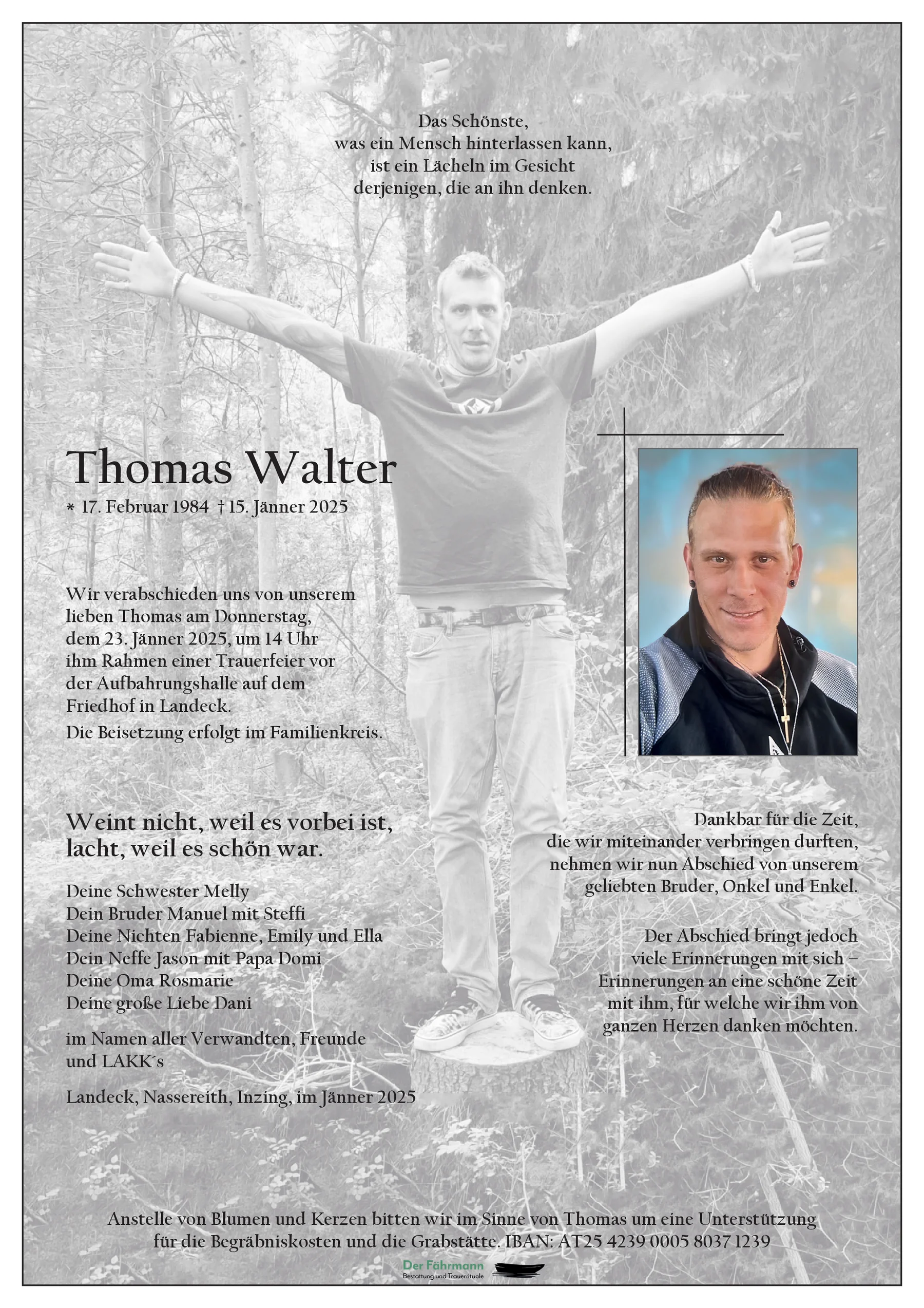 Möcht euch unser aufrichtiges Beileid aussprechen,so schad um Thommy denk a gern an früher zrug wo ma alle die Zeit zusammen verbracht haben ,war immer lustig und voll fein und Thommy war a immer da sei es beim Wohnungsbrand oder sonst a Situation !Hab ihn dann leider komplett aus die Augen verloren!Aber es tuat ma fest leid für euch alle ,i weiß es ist an großer Verlust für euch!