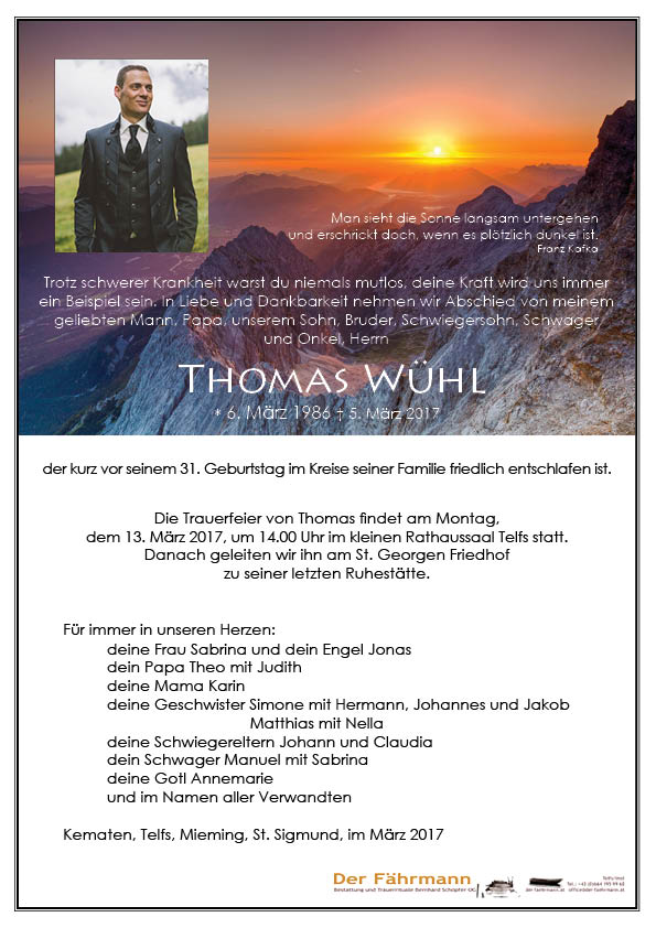 unsere Gedanken sind bei Dir und dem kleinen Spatz Jonas. Wir bewundern Deine Stärke - Jonas hat sich eine wunderbare Mama ausgesucht. Die Abschiedsfeier für Thomas war sehr bewegend und wunderschön gestaltet. Wir wünschen Dir viel Kraft für die kommende Zeit, wir sind sehr gerne und jederzeit für Dich da. Herzlichst Hansjörg und Angelika