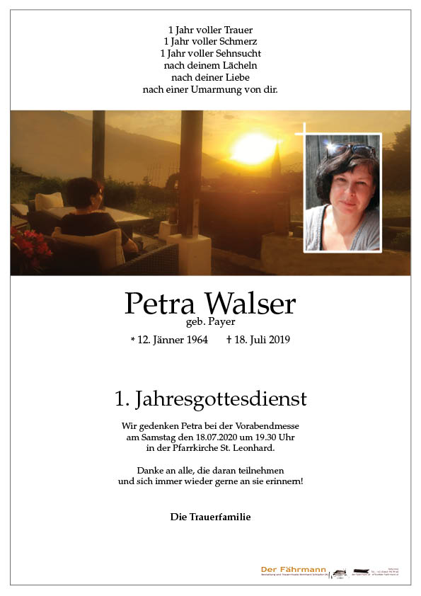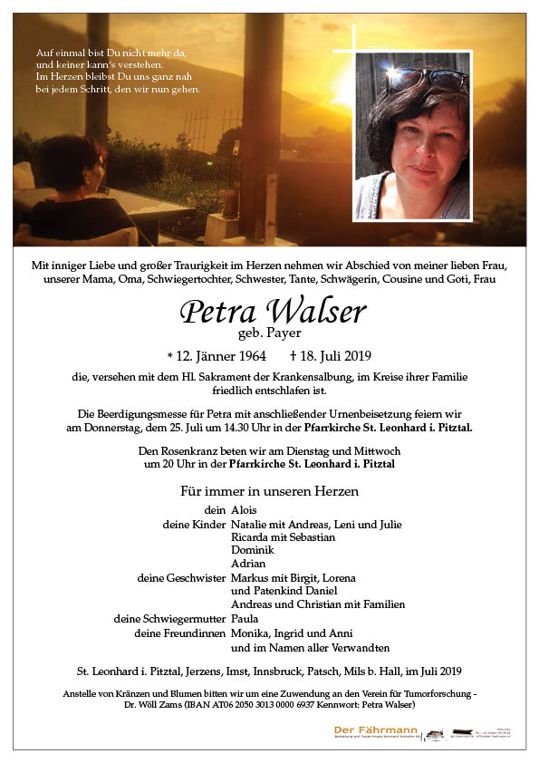 Lieber Lois, liebe Kinder, es ist so traurig das Petra schon so früh von euch geh'n musste, ich hatte mit Petra so eine schöne Schul und Jugendzeit verbringen können,die werd ich nie vergessen,sie war immer freundlich und hatte ihren Humor und war so lebenslustig wenn ich sie getroffdn habe.Mann kann es nicht glauben das sie nicht mehr bei uns ist. Liebe Petra ich wünsche dir eine gute Reise beschütze deine lieben. In lieber Erinnerung christl