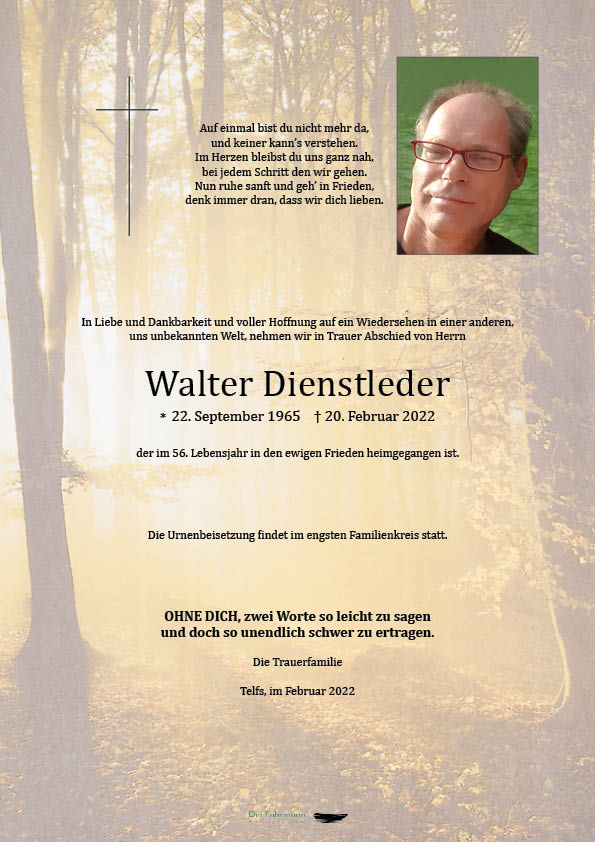 Walter Dienstleder 22.09.1965 20.02.2022 Telfs Parte Gedenkkerzen Kondolenzen Parte downloaden Gedenkkerzen für Walter Dienstleder 29 Einträge Kerze anzünden Jasmine Wir vermissen dich immer noch In lieber Erinnerung, Frank In Gedenken, Frank Wir lieben und vermissen dich lieber Papa Wir lieben und vermissen dich lieber Papa Liebes Gedenken des Betriebsrates und der Belegschaft vom Ow A Liachtl für die Reise Hausgemeinschaft Anton- Auer-Straße Nachbarin Anton-Auer-Straße Bernhard A Lichtlein aus Tarrenz Ruhe in Frieden Ruhe in Frieden Ruhe in Frieden! Hans und Verena Ruhe in Frieden A Liachtl aus Telfs Ruhe in Frieden Thomas und Elisabeth A Liachtl für di ..Deine Nachbarin Daniela Ruhe in Frieden Gerald und Manuela R.I.P.Melanie u.Claudia m. Niobe! Ruhe in Frieden! Martin u. Christine. Ein Licht aus Tarrenz RIP Traudi Kranebitter-Kleinheinz Eine gute Überfahrt Bestattung DER FÄHRMANN a Lichtl aus Pfaffenhofen Rip Angelika und. Florian Ruhe in Frieden Erika und Margit Ruhe in Frieden 🕯😔 RIP. Ilse Zorzi Eine Kerze für Walter Dienstleder Ihr Name* Ihre Nachricht oder Name* E-Mail-Adresse* Mit dem Klicken auf "Kerze anzünden" erklären Sie sich mit unseren Datenschutzbestimmungen einverstanden. Kondolenzbuch für Walter Dienstleder 2 Einträge Kondolenz verfassen Walter: Ruhe in Frieden! Jutta Jutta 10.03.2022 | 19:34 Uhr Mein Beileid zum Heimgang von Walter. Bernhard 08.03.2022 | 18:10 Uhr Ihr Abschiedsgruß an Walter Dienstleder Ihr Name* E-Mail-Adresse* Ihre Nachricht* Mit dem Klicken auf "Gruß absenden" erklären Sie sich mit unseren Datenschutzbestimmungen einverstanden. Walter Dienstleder 22.09.1965 – 20.02.2022 Parte Gedenkkerzen Kondolenzen Kerze anzünden Kondolenz verfassen