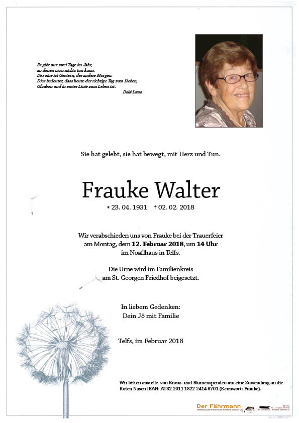 Walter Frauke 23.04.1931 02.02.2018 Telfs Beisetzungs-Ort: St. Georgenfriedhof Telfs Parte Gedenkkerzen Kondolenzen Parte downloaden Gedenkkerzen für Walter Frauke 70 Einträge Kerze anzünden Ruhe in Frieden Wolfgang Köck In stillem Gedenken HR Dr. Rudolf Havas, Salzburg Fam. Karin Brugg Oberthanner Luise und Marlene Friede u Licht Beate Konrad-Fiedler Aufrichtige Beileid Fam.Hueber Pia und Maria Scheiring Fam. Dolores und Hubertus Viehweider Maria Grasmair Doris und Hans Peter Schiller Hilde und Pepi Ruetz Fam. Marina & Hubert Rück In Gedenken Gertraud Scharmer Im stillen Gedenken In liebem Gedenken - Franz und Susanne Pramhaas Pfl.Heinz Hautlinik Fam. Robert und Nadja Reindl Familie Josef Gruber Flora mit Familie Marlies u. Siegfried Aufrichtiges Beileid! Sybille Fischer-Meil In stiller Anteilnahme Sie möge in Frieden ruhen Peter Raffelsberger liebe letzte Grüße Traudi Kranebitter-Kleinheinz Barbara und Benedikt Kranebitter Dora und Josef Hosp Gabriele Aichler - Egger Edeltraud Egger Herzliches Beileid,Familie Zobl Gruber Lukas Aufrichtiges Beileid, Brigitte Fauland Josef u. Brunhilde Federspiel Manuela Jeitner m. Familie (Tumpen im Ötztal) Christine Haslwanter Vroni Elgamal mit Familie Krenn R.I.P. Elisabeth Stroj m. Fam Wolfgang Köck Klaus und Karin Hechenberger Aufrichtige Anteilnahme, Rappold Christine Monika Raffelsberger Fam. Zankai Alfons Ulli Langmaier,Mayrhofen In lieber Erinnerung Eva Hohenegger Familie Angelika Jäger Waltraud mit Familie Arnold Wackerle In lieber Erinnerung Familie Ladstätter Fam. Christl und Manfred Furtner mit Mama Ida Eva, Burkhard, Magdalena und Maximilian Mair Heidi u. Andreas Paregger letzte Grüße! Fam. Krismer Kathrin Marion Girstmair-Hackl mit Familie In liebem Gedenken Grete und Rudi Hackl Rudolf und Gerlinde Fam. Andrea+Anton Mederle Monika Schletterer-Falbesoner Sabine und Gianni Benatti Fam. Sonja und Luis Bachhuber Familie Lisa Götsch Christine Strasser Gabriele Margreiter Herta Margreiter Ruhe in Gottes Frieden! Fam. Ferdinand Reitmaier Sieglinde Kobler Federspiel Josef u. Brunhilde Anne Marie und Roland Perus eine gute Überfahrt – Bestattung DER FÄHRMANN Eine Kerze für Walter Frauke Ihr Name* Ihre Nachricht oder Name* E-Mail-Adresse* Mit dem Klicken auf "Kerze anzünden" erklären Sie sich mit unseren Datenschutzbestimmungen einverstanden. Kondolenzbuch für Walter Frauke 1 Eintrag Kondolenz verfassen Mein herzliches Beileid! Maria-Luise Rigger mit Familie Rigger Maria-Luise 09.02.2018 | 21:54 Uhr Ihr Abschiedsgruß an Walter Frauke Ihr Name* E-Mail-Adresse* Ihre Nachricht* Mit dem Klicken auf "Gruß absenden" erklären Sie sich mit unseren Datenschutzbestimmungen einverstanden. Walter Frauke 23.04.1931 – 02.02.2018 Parte Gedenkkerzen Kondolenzen Kerze anzünden Kondolenz verfassen
