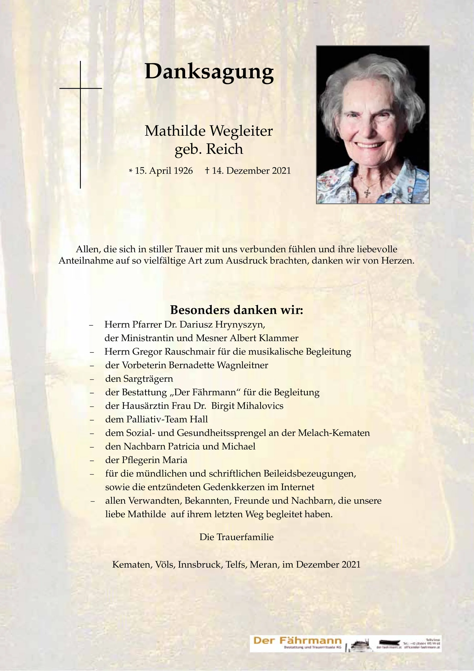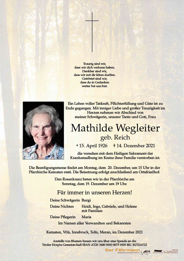 Wegleitner Mathilde 15.04.1926 14.12.2021 Kematen Beisetzungs-Ort: Ortsfriedhof Kematen Aufbahrungs-Ort: Aufbahrungshalle Kematen Parte Gedenkkerzen Kondolenzen Danksagung Parte downloaden Gedenkkerzen für Wegleitner Mathilde 38 Einträge Kerze anzünden A liachtl für di Jasmin und Stefan mit Gabriel und Paula A liachtl für di Jasmin und Stefan mit Gabriel und Paula A liachtl für di Jasmin und Stefan mit Gabriel und Paula A liachtl für di A liachtl für di A liachtl für di Dietmar u.Sabine Beiler Das ewige Licht leuchte dir .. Dr. Mihalovics Birgit In lieber Erinnerung Sandra und Christoph Im stillen Gedenken In stillem Gedenken a Liachtl In lb. Erinnerung Pepi u. Martha Schaffenrath In lb. Erinnerung Pepi u. Martha Schaffenrath In lieber Erinnerung!! Doris A Liachtl für di A Liachtl für di A Liachtl fürn Hoamweg Sigrid Ruhe in Frieden Ruhe. In Frieden Ruhe in Frieden Liebe Hilde in Lieber Erinnerung Maria Ruhe in Frieden Katharina Fiechter In lieber Erinnerung Sieglinde 0stermann - Prosch und Thomas In lieber Erinnerung Monika und Siggi In lieber Erinnerung Monika und Siggi 🌹R.I.P MARION 🌹 🌹R.I.P MARION 🌹 Ruhe in Frieden! Daniela, Max, Maximilian, Matthias Für immer in meinem Herzen ❤ Sabine mit Lukas und Luni Liebe Goti, wir werden dich nie vergessen. Hella und Felix Ruhe in Frieden resi wegscheider Wir werden dich nie vergessen! Silvia, Michi, Lydia, Günther Meine Lieblingstante wird unvergessen bleiben! Thomas In ewiger Dankbarkeit! Stefan, Jasmin, Gabriel und Paula Margret und Peter Fleischmann Liebe Goti werden dich nie vergessen. Gabi und Erwin In lieber Erinnerung! Lisi Eine gute Überfahrt Bestattung DER FÄHRMANN Eine Kerze für Wegleitner Mathilde Ihr Name* Ihre Nachricht oder Name* E-Mail-Adresse* Mit dem Klicken auf "Kerze anzünden" erklären Sie sich mit unseren Datenschutzbestimmungen einverstanden. Kondolenzbuch für Wegleitner Mathilde 0 Einträge Kondolenz verfassen Ihr Abschiedsgruß an Wegleitner Mathilde Ihr Name* E-Mail-Adresse* Ihre Nachricht* Mit dem Klicken auf "Gruß absenden" erklären Sie sich mit unseren Datenschutzbestimmungen einverstanden. Danksagung downloaden Wegleitner Mathilde 15.04.1926 – 14.12.2021 Parte Gedenkkerzen Kondolenzen Danksagung Kerze anzünden Kondolenz verfassen