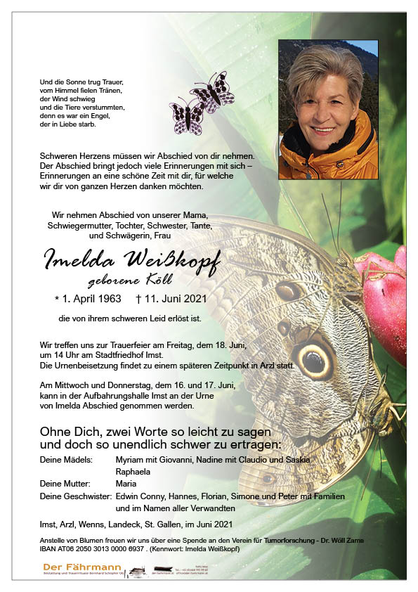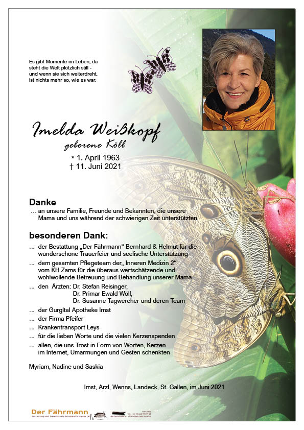 Es tut mir so unendlich leid das ihr so früh eure mama gehen lassen musste! Imelda war eine sehr lebensfrohe Frau mit viel Witz u Humor! Ihre ratscher werden mir im Schwimmbad fehlen! Liebe saskia fühl dich umarmt u gedrückt! Denke fest an dich u traure schweigend mit! Mein aufrichtiges Beileid!