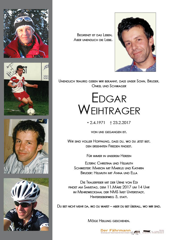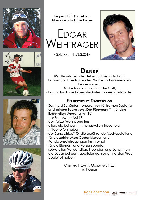 Wir danken allen, die uns auf unterschiedliche Weise immer wieder spüren lassen, dass sie unseren geliebten Edgar nicht vergessen.