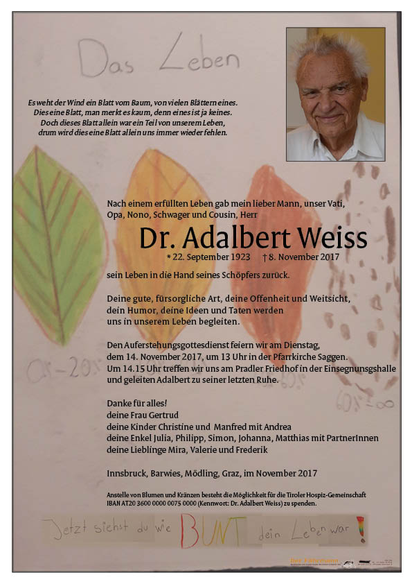 Weiss Adalbert 22.09.1923 08.11.2017 Innsbruck Beisetzungs-Ort: Pradler Friedhof Parte Gedenkkerzen Kondolenzen Parte downloaden Gedenkkerzen für Weiss Adalbert 8 Einträge Kerze anzünden In lieber Erinnerung Edith Oitzinger-Freudenthaler Ruhe in Frieden Wolfgang Köck a Liechtl für die Reise Unser herzlichtes Beileid. Schweigl Herbert, Gerlinde u. Pia Fam. Peter-Paul Obererlacher, Strassen Maria Obererlacher, Wenza eine gute Überfahrt Bestattung DER FÄHRMANN Eine Kerze für Weiss Adalbert Ihr Name* Ihre Nachricht oder Name* E-Mail-Adresse* Mit dem Klicken auf "Kerze anzünden" erklären Sie sich mit unseren Datenschutzbestimmungen einverstanden. Kondolenzbuch für Weiss Adalbert 1 Eintrag Kondolenz verfassen Maria Obererlacher, Wenza Maria Obererlacher 09.11.2017 | 15:36 Uhr Ihr Abschiedsgruß an Weiss Adalbert Ihr Name* E-Mail-Adresse* Ihre Nachricht* Mit dem Klicken auf "Gruß absenden" erklären Sie sich mit unseren Datenschutzbestimmungen einverstanden. Weiss Adalbert 22.09.1923 – 08.11.2017 Parte Gedenkkerzen Kondolenzen Kerze anzünden Kondolenz verfassen