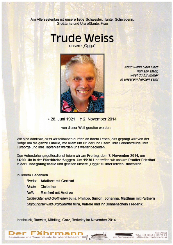 Weiss Trude 28.06.1921 02.11.2014 Innsbruck Beisetzungs-Ort: Pradler Freidhof Parte Gedenkkerzen Kondolenzen Parte downloaden Gedenkkerzen für Weiss Trude 0 Einträge Kerze anzünden Eine Kerze für Weiss Trude Ihr Name* Ihre Nachricht oder Name* E-Mail-Adresse* Mit dem Klicken auf "Kerze anzünden" erklären Sie sich mit unseren Datenschutzbestimmungen einverstanden. Kondolenzbuch für Weiss Trude 0 Einträge Kondolenz verfassen Ihr Abschiedsgruß an Weiss Trude Ihr Name* E-Mail-Adresse* Ihre Nachricht* Mit dem Klicken auf "Gruß absenden" erklären Sie sich mit unseren Datenschutzbestimmungen einverstanden. Weiss Trude 28.06.1921 – 02.11.2014 Parte Gedenkkerzen Kondolenzen Kerze anzünden Kondolenz verfassen