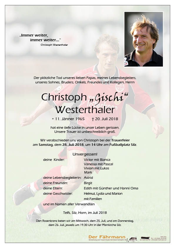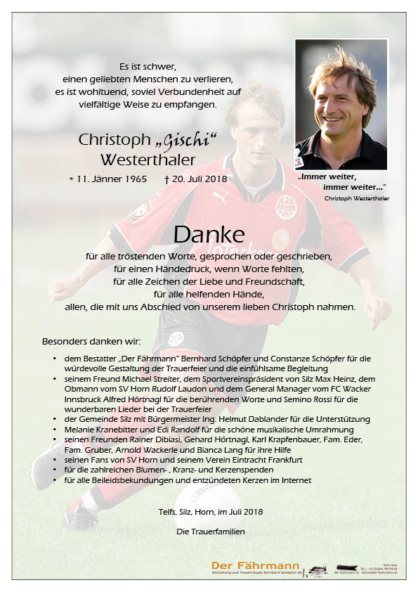 Wir verabschieden uns von einem großen Sportler, einem tollen Fußballer, vor einem einzigartigen Menschen. Ein letzter sportlicher Gruß lieber Christoph „Gischi“ Westerthaler!