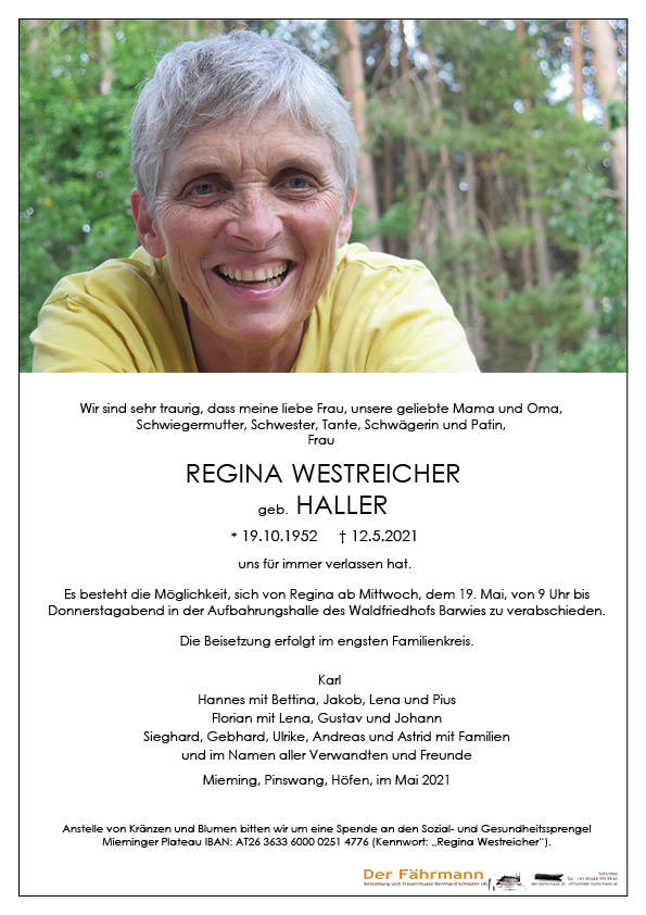 Liebe Trauerfamilie, wir werde Regina in Erinnerung behalten als
