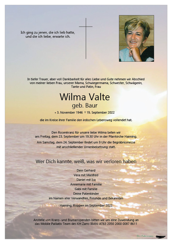 Herzliche Anteilnahme am Tode Deiner Frau, Eurer Mama , Eurer Schwester.Wilma war ein liebenswerter , feiner und hilfsbereiter Mensch. Sie hat sehr viel mit ihrem Fleiß und Können am Weiterbestand des altem Brauchtums mitgewirkt. Wir wünschen Euch viel Kraft in dieser harten, traurigen Zeit.wir begleiten Euch in Gedanken Gerdi und Haymo