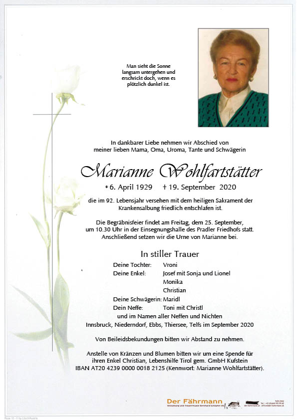 Wohlfartstätter Marianne 06.04.1929 19.09.2020 Innsbruck Beisetzungs-Ort: Pradler Fiedhof Parte Gedenkkerzen Kondolenzen Parte downloaden Gedenkkerzen für Wohlfartstätter Marianne 12 Einträge Kerze anzünden Ruhe in Frieden Ruhe in Frieden Ruhe in Frieden In lieber Erinnerung Sabine In lieber Erinnerung Sabine Eine Kerze für die letzte Reise Lisa Ruhe in Frieden Ingrid Ruhe in Frieden. Christian Ruhe in Frieden. Vroni Ein Licht für dich. Monika Ruhe sanft. Josef mit Sonja und Lionel eine gute Überfahrt Bestattung DER FÄHRMANN Eine Kerze für Wohlfartstätter Marianne Ihr Name* Ihre Nachricht oder Name* E-Mail-Adresse* Mit dem Klicken auf "Kerze anzünden" erklären Sie sich mit unseren Datenschutzbestimmungen einverstanden. Kondolenzbuch für Wohlfartstätter Marianne 0 Einträge Kondolenz verfassen Ihr Abschiedsgruß an Wohlfartstätter Marianne Ihr Name* E-Mail-Adresse* Ihre Nachricht* Mit dem Klicken auf "Gruß absenden" erklären Sie sich mit unseren Datenschutzbestimmungen einverstanden. Wohlfartstätter Marianne 06.04.1929 – 19.09.2020 Parte Gedenkkerzen Kondolenzen Kerze anzünden Kondolenz verfassen