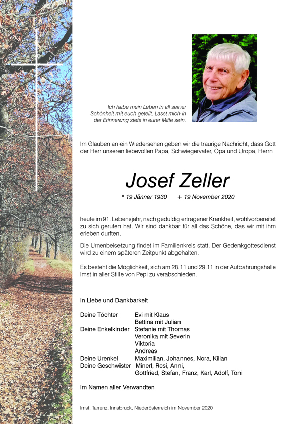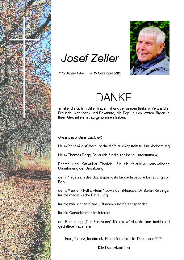Mit Wehmut ereilte uns die Nachricht vom Ableben eures allseits beliebten Vaters, treusorgendem Opa, Uropa, Schwiegervater und Bruder Pepi Zeller.